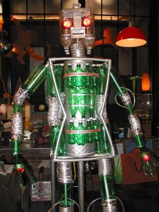 Bottle Bot is an art piece made by Spencer in iCarly that lives in the back of the Shay apartment. It is made out of recycled soda bottles and has glowing red eyes, and has been used as a babysitter and fencing partner.